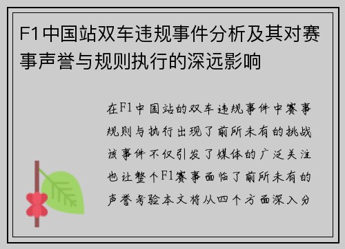在F1中国站的双车违规事件中,赛事规则与执行出现了前所未有的挑战。该事件不仅引发了媒体的广泛关注,也让整个F1赛事面临了前所未有的声誉考验。本文将从四个方面深入分析F1中国站双车违规事件及其对赛事声誉与规则执行的深远影响。首先,本文将讨论事件的背景及原因,分析赛事组织方的应对措施;其次,探讨违规行为对车队和车手的影响;再次,分析该事件对F1规则执行与公正性的冲击;最后,探讨该事件对F1赛事声誉的长期影响。通过这些分析,我们将全面了解该事件给F1带来的深远变化,以及未来如何避免类似问题的发生。