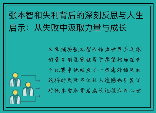 失败并非终结,而是一个新的开始。每一次的失利,都是一次反思的机会,让我们更加清楚地认识到自己的不足,从而不断提升自己,迎接未来的挑战。张本智和通过从失败中汲取力量,最终走向了更加成熟的道路,也为所有人提供了宝贵的成长智慧。